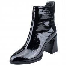 Material: Piele naturală lăcuită, cu un model tip crocodil. Culoare: Negru. Închidere: Fermoar lateral. Talpă și toc: Talpă groasă și toc pătrat, stabil, cu o înălțime de aproximativ 9 cm. Stil: Ghete înal...